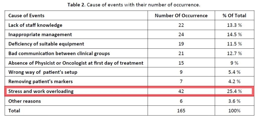 Work-related stress is not only disruptive for the working health care individual11 but can also have a detrimental effect on the interaction with the cancer patient; especially in radiotherapy, who might be experiencing a high stress level of distress1-3. Studies have shown that physical and emotional burnout can lead to erosion of physician compassion and the quality of care physicians deliver12-13. In addition, healthcare professionals under distress are also more likely to make errors of judgement14 which may impact the aim for a seamless and error-free treatment execution in radiation therapy.